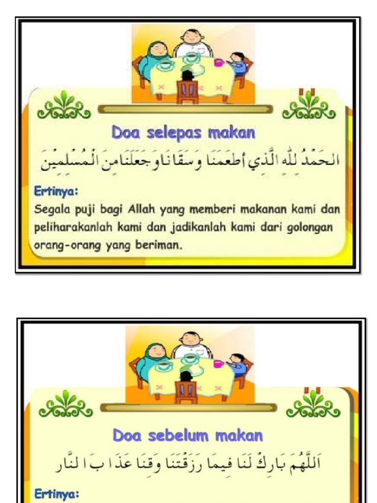 English translation of lyrics for doa makan by raihan. Bagaimana agar makanan yang masuk ke tubuh kita mendapat keberkahan sehingga menghasilkan dan kemaslahatan? اللَّهُمَّ بَارِكْ لَنَا فِيهِ وَأَطْعِمْنَا خَيْرًا مِنْهُ. Yang sunnah ialah baca bismlllah dan terus sahaja makan. Nasyid doa sebelum makan mp3. Makan dan minum perintah tuhan terkandung di dalam alquran tapi jangan translation in english. Prayer before meals, prayer before study. Ambil makanan yang hampir terlebih dahulu. Maka otomatis anda akan disadarkan pada makna. Ya allah berkatilah kami padanya (makanan kami) dan kurniakanlah kami makanan yang lebih baik darinya.. الْحَمْدُ لِلَّهِ الَّذِي أَطْعَمَنِي هَذَا الطَّعَامَ وَرَزَقَنِيهِ مِنْ غَيْرِ حَوْلٍ مِنِّي وَلاَ قُوَّةٍ. Diriwayatkan daripada tsauban beliau berkata, apabila selesai mengerjakan solat, rasulullah saw membaca istighfar tiga kali lalu. Setakat ini banyak tempahan daripada pihak sekolah khususnya tempahan bahan bantu mengajar dan pembelajaran iaitu dalam bentuk bunting dan juga banner.begitu juga.